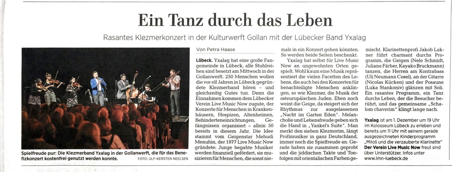 „Rasantes Klezmerkonzert in der Kulturwerft Gollan mit der Lübecker Band Yxalag“ – Lübecker Nachrichten