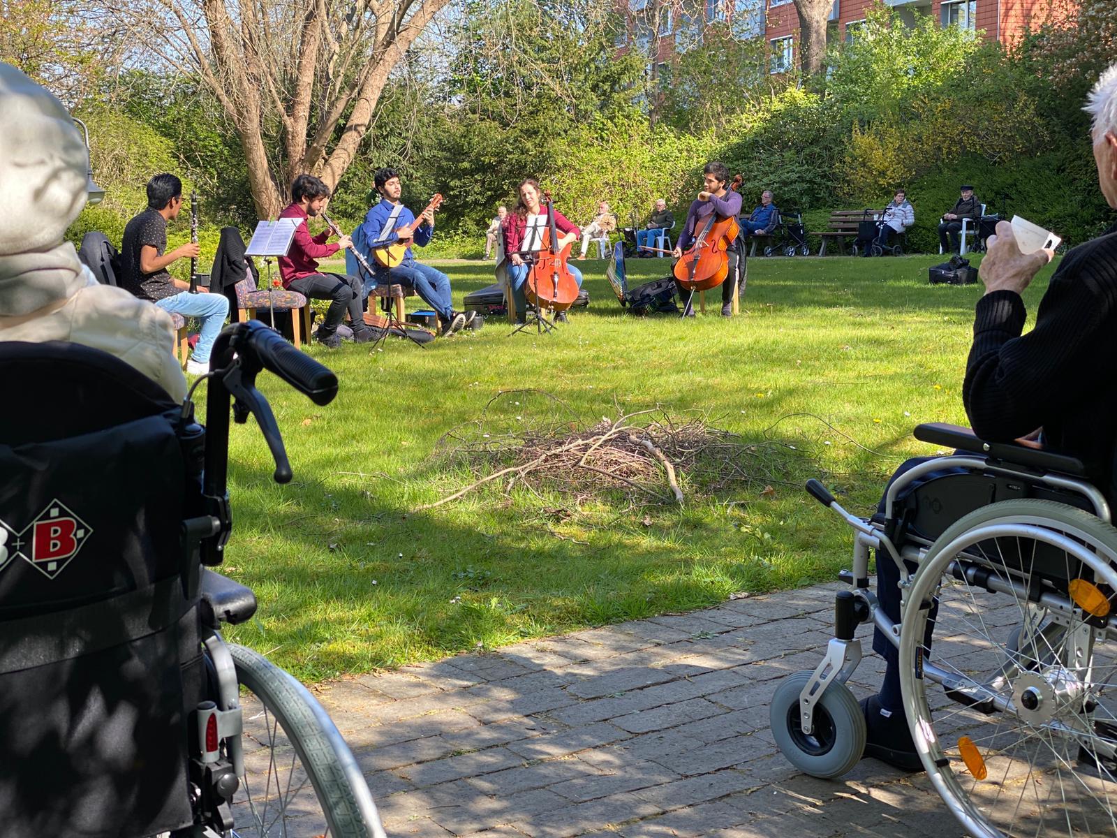 Nicht nur den Senioren, auch den Künstlern bringt der ungewöhnliche Termin Freude. „Ich finde das schön“, sagt Belén Sánchez Pérez, die schon mehrfach „Live Music Now“-Konzerte gegeben hat. „Normalerweise können wir dem Publikum nah sein, das geht jetzt nicht.“ Die Musiker sind zudem froh über die Auftrittsgelegenheit. Pro Konzert erhalten sie als Gage eine Stipendienzahlung. „Für viele Künstler ist es aktuell schwierig“, berichtet Alexander Vergara. Die fünf kommen aus Spanien und Süd amerika und studieren an der Musikhochschule Lübeck.