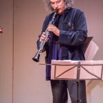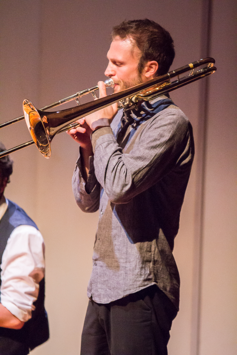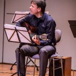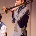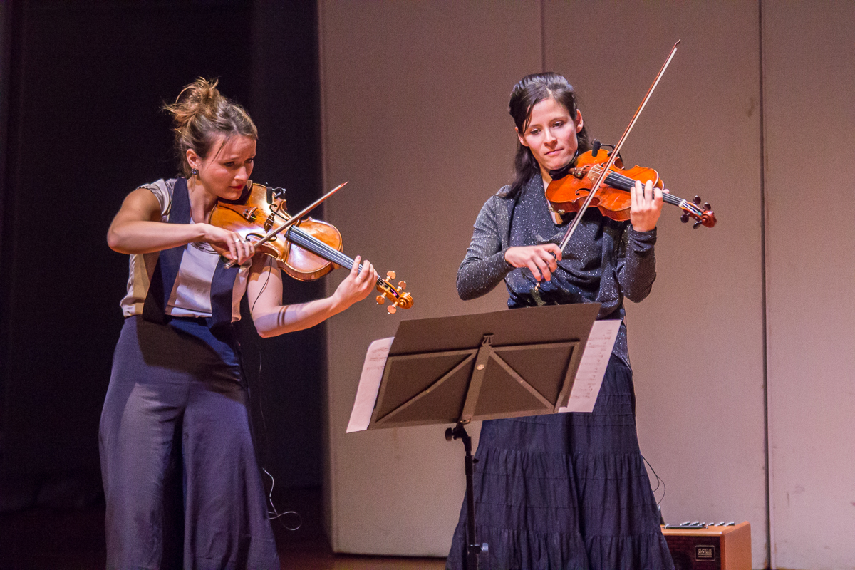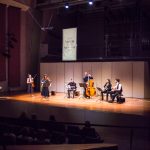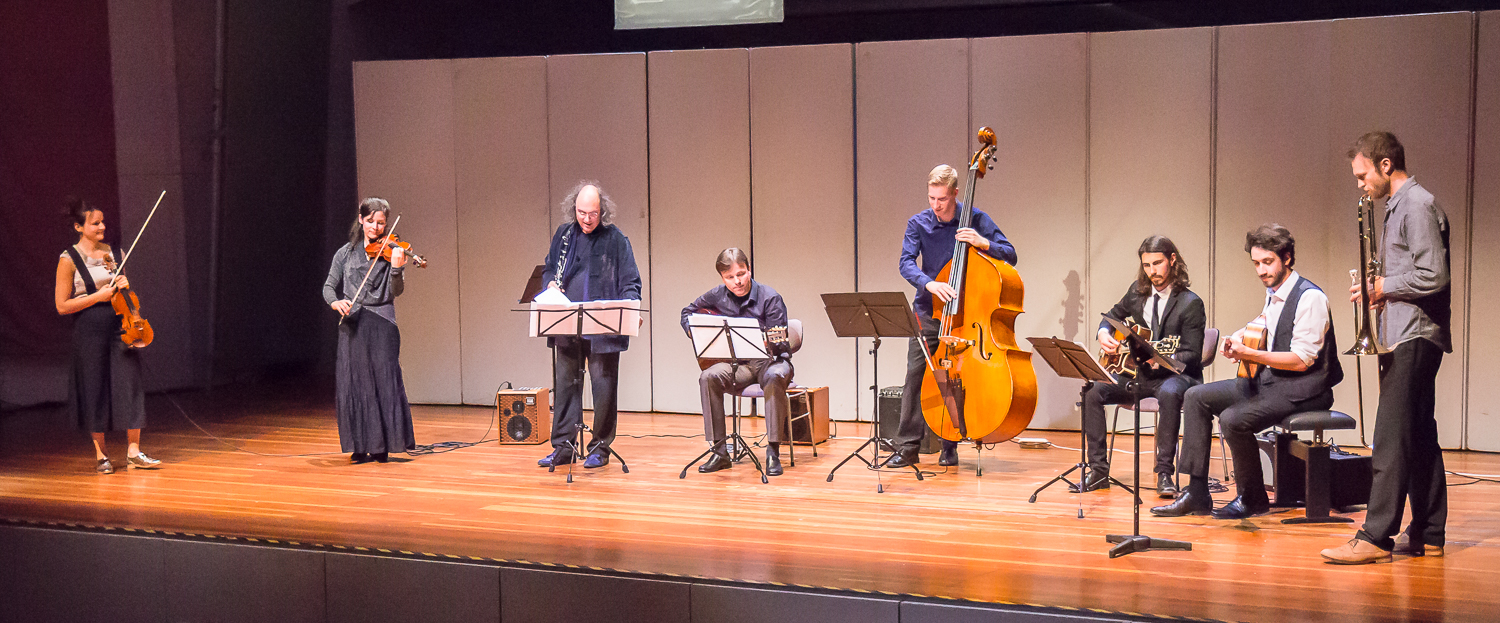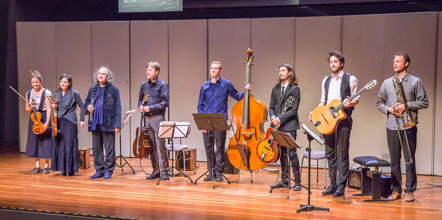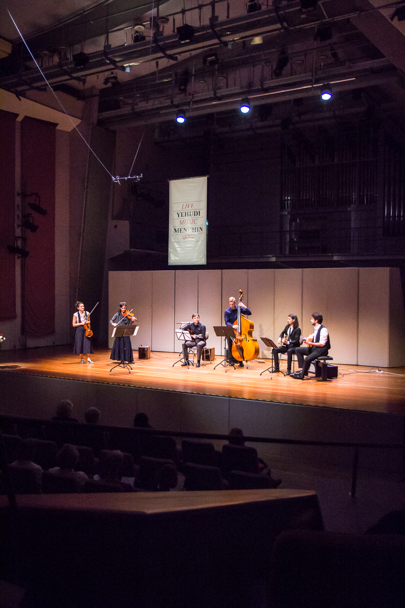 Der letzte Teil brachte Entdeckungen Menuhins in verwandten Bereichen. Bartok für Geige allein gab Shoko Murakami Gelegenheit zu glänzen. Danach die Begegnung zweiter Welten: Menuhin und der Jazz-Violonist Stéphane Grappelli. Hierfür war ein Sextett ehemaliger LMN-Stipendiaten aufgeboten: die Geigerinnen Nele Schaumburg und Kayako Bruckmann, dreimal Gitarre (Frederik Schlender, Nicolas Kücken, Patrick Farrant) und Kontrabass (Jan-Niklas Eichert). Zum Schluss kamen Klarinette (Bernd Ruf) und Posaune (Luka Stankovic) hinzu. Mit Swing, Klezmer und Zigeunerjazz wurden die Besucher verabschiedet; nach ziemlich genau vier Stunden. /kd