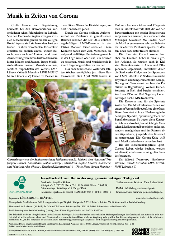 „Musik in Zeiten von Corona“ – Lübeckische Blätter vom 30. Mai 2020 –