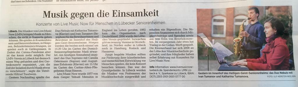 Lübecker Nachrichten, 25. April 2020 (Konzert vom 24.04.)